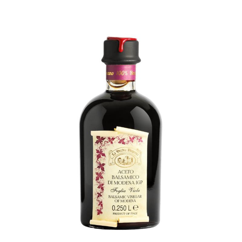 Der „Violett Etikett“ Balsamico di Modena IGP von La Vecchia Dispensa ist ein feiner Aceto Balsamico di Modena IGP, der durch eine sorgfältige Reifung in Holzfässern seine elegante Balance aus Süße und milder Säure entwickelt. Die traditionelle Herstellung verleiht ihm eine fruchtige Note und einen geschmeidigen Geschmack, der jede Mahlzeit bereichert.