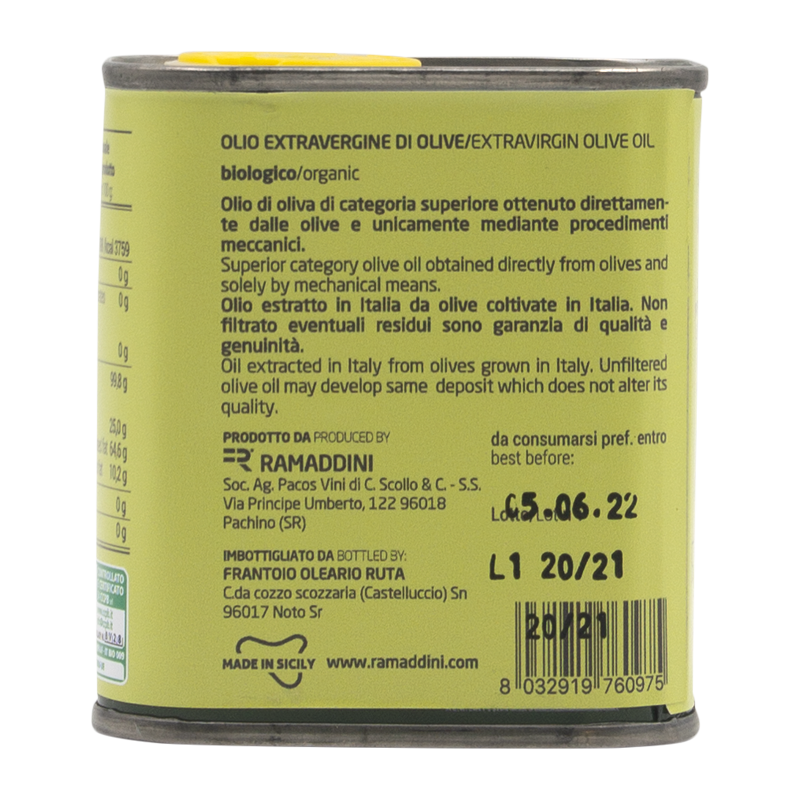 Das „Ramaddini“-Öl besteht aus den beiden Olivensorten Biancolilla und Nocellara. Innerhalb von acht Stunden nach der Ernte werden die Oliven kaltgepresst. Das Öl wird nicht gefiltert, was dessen Farbe ein wenig eintrübt, den Geschmack aber umso oliven-intensiver werden lässt.