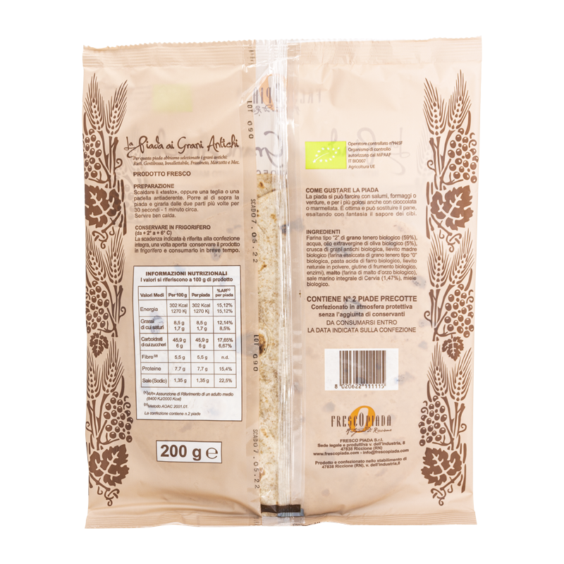 In unserem breiten Angebot an handgefertigten Piadas darf eine Bio-Piada nicht fehlen, die Geschmack und Duft mit der zunehmenden Bedeutung gesunder, umweltfreundlicher Lebensmittel verbindet. Deshalb haben wir begonnen, mit einer Mühle zusammenzuarbeiten, die durch biologischen Anbau mit Fruchtfolgen, Gründüngung und anderen Leguminosen, die nützliche Nährstoffe liefern, in der Lage ist, Nachhaltigkeit und die Produktion eines Rohstoffs von höchster Qualität zu gewährleisten, indem sie alte Getreidesorten wie Rieti, Gentilrosso, Indochina und andere Weizensorten verwendet: Rieti, Gentilrosso, Inallettbile, Frassineto, Piave, S. Pastore, Fiorello, Belvedere, Marzotto, sowohl in Reinform als auch in Mischungen, alle biologisch. Die sehr schonende und langsame Steinmahlung und das natürliche Vorhandensein des Keims sorgen dafür, dass das Mehl, das wir für diese Piada verwenden, die ernährungsphysiologischen Eigenschaften des ganzen Korns bewahrt. Die gleiche Aufmerksamkeit wurde natürlich auch der Suche nach allen anderen Bio-Zutaten für unsere Piada mit alten Getreidesorten gewidmet.