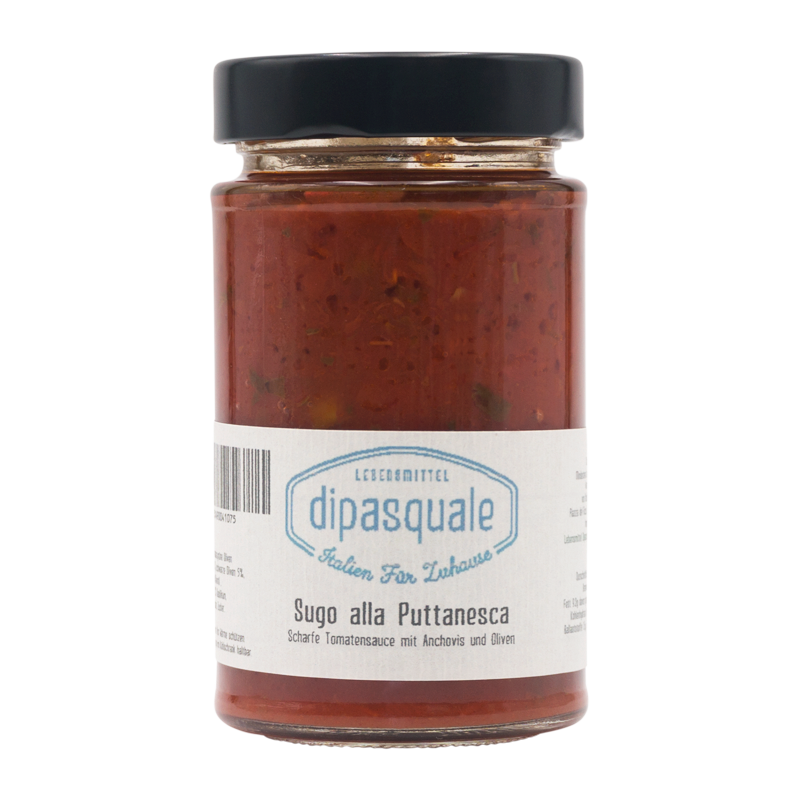 Diese einzigartige Pasta in Form kleiner „verrückter Räder“ sorgt für Spaß und Geschmack auf dem Teller. Hergestellt nach traditionellen Verfahren, bietet sie perfekte Bissfestigkeit und nimmt Saucen hervorragend auf – ein echter Hingucker auf dem Tisch. - „Sugo alla Puttanesca“: Pasta-Sauce mit Tomaten, Oliven und Kapern (280g – Selezione Dipasquale)