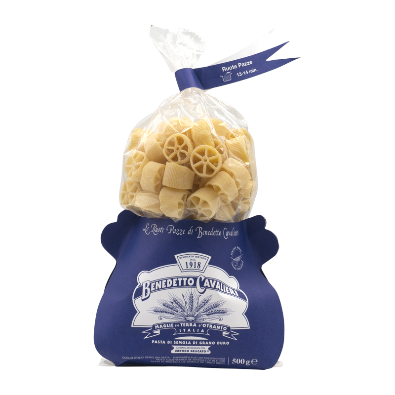 Dieser feinperlige Prosecco aus der Region Valdobbiadene besticht durch seine eleganten, fruchtigen Aromen mit einer dezenten Süße und einem spritzigen Charakter. Perfekt als Aperitif, um den Abend mit einem Hauch italienischen Luxus einzuläuten. - Pasta „Ruote pazze“ (500g – Benedetto Cavalieri)