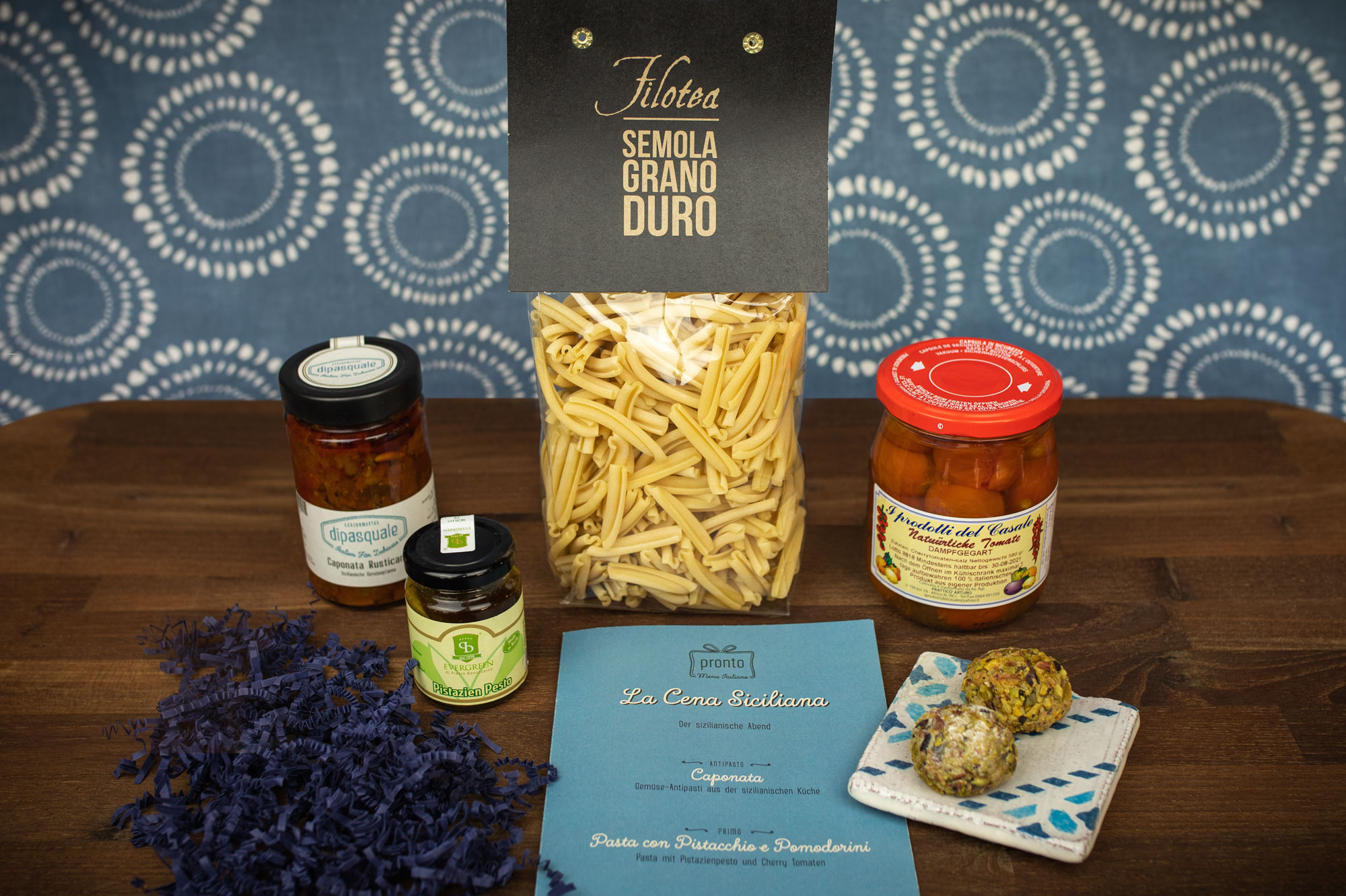 In jedem Geschenkkorb findest du außerdem einen Rezeptbogen mit Inspirationen für den perfekten sizilianischen Abend. Der Geschenkkorb „Der Sizilianische Abend“ ist eine Einladung, die Seele Siziliens zu schmecken – ideal als Geschenk für Feinschmecker oder einfach, um einen Abend voller Genuss und Geselligkeit zu erleben.