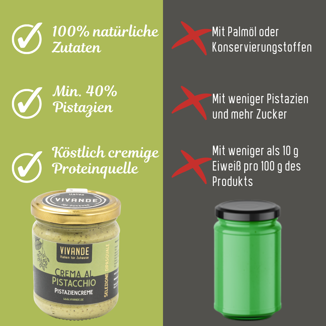 Die Pistaziencreme von Vivande bietet zahlreiche Vorteile, die sie zu einer gesunden Alternative zu anderen Brotaufstrichen machen. Mit mind. 40% an Pistazien Anteil sie ist reich an fett und Ballaststoffen und Proteinen, was sie zu einem nahrhaften Begleiter für den Start in den Tag macht. Zudem ist sie glutenfrei und somit ideal für Menschen mit Glutenunverträglichkeit. Ob als Brotaufstrich, Zutat in Süßspeisen oder pur genossen – die Pistaziencreme ist ein echter Gaumenschmaus, der jeden Bissen zu einem besonderen Erlebnis macht.