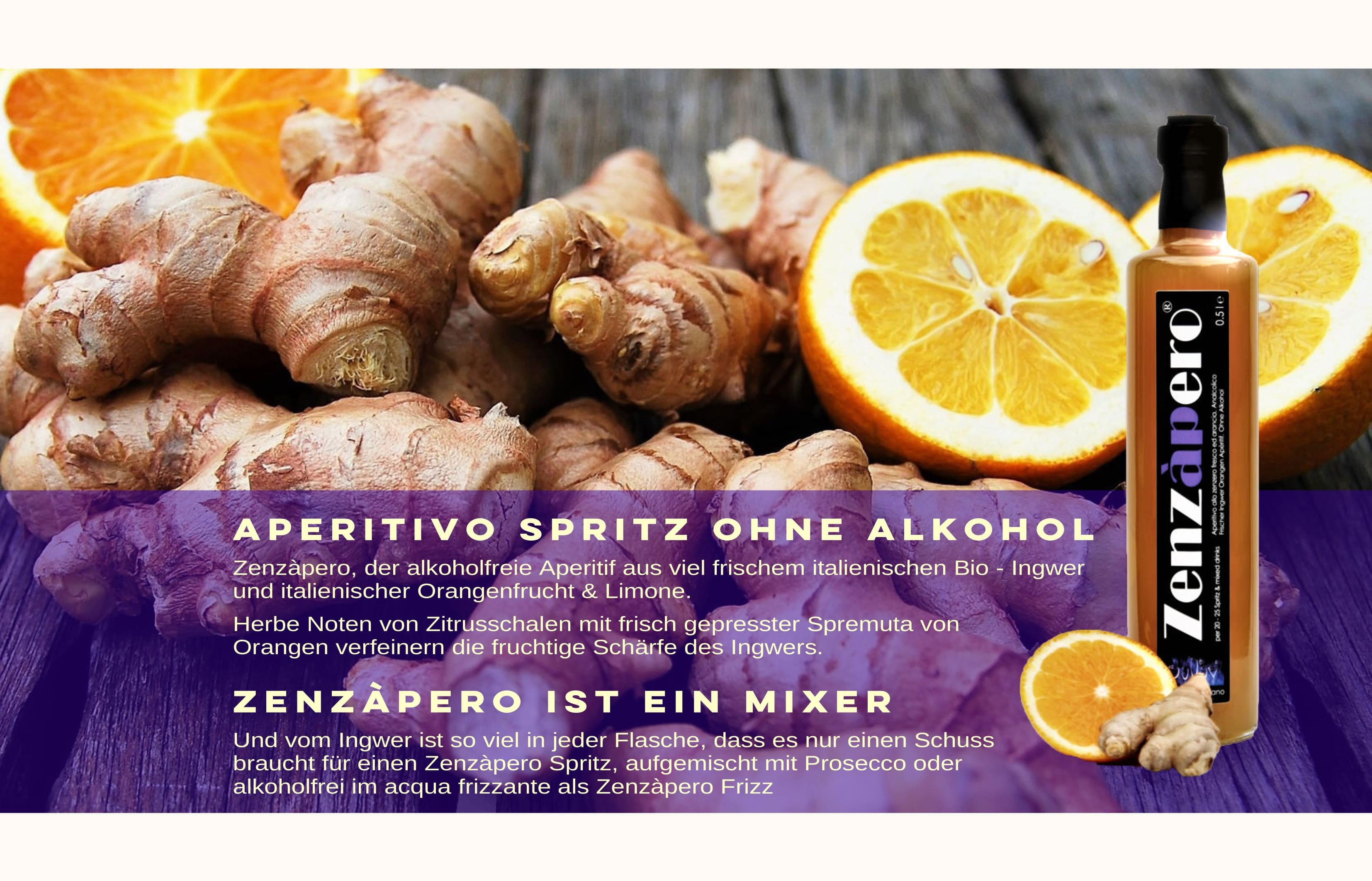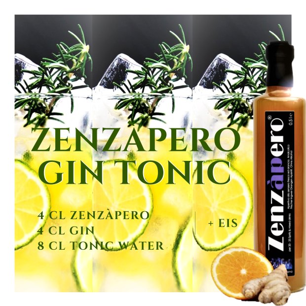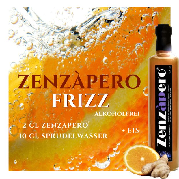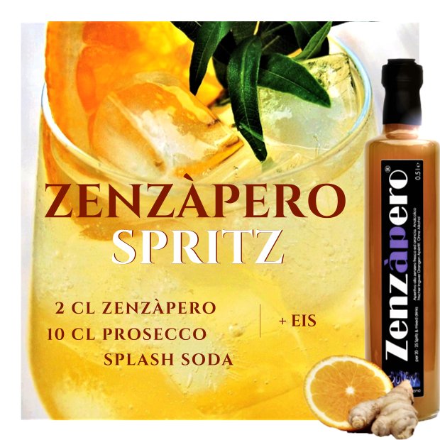 ZENZÀPERO IST EIN MIXER Und vom Ingwer ist so viel in jeder Flasche, dass es nur einen Schuss braucht für einen Zenzàpero Spritz, aufgemischt mit Prosecco oder alkoholfrei im acqua frizzante als Zenzàpero Frizz